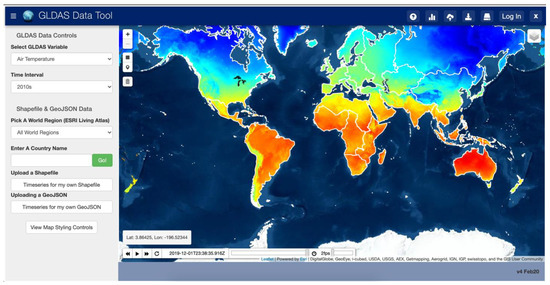 We developed a web app (the GLDAS App) to validate that the Grid tools work sufficiently fast for use in web environments. We developed The GLDAS App using the Tethys Platform. Tethys is an extension of the Django Model View Controller framework built on open-source Python code as well as PostgreSQL databases. Tethys Platform is intended to “lower the barrier” to creating web apps by providing a command line interface, template apps, code samples and examples, and documentation which helps users more quickly develop and deploy web apps [44]. It has been used for multiple applications that require access to multidimensional data sources which developed custom querying code and could have benefited from Grids [37,40,45]. We selected the NASA monthly-averaged GLDAS product as the gridded data for this test since the files have a small disc size, are easily accessible, and cover a long time period of more than 70 years. NASA provides an OPeNDaP web service for access to the GLDAS dataset. However, we did not build the GLDAS App to query that web service since we wanted to demonstrate that, given any multidimensional dataset, this code executes sufficiently fast to be used in web environments. This app accesses NetCDF files stored on the web server. The GLDAS product spans two spatial dimensions and one time dimension with approximately thirty variables spanning those three dimensions.