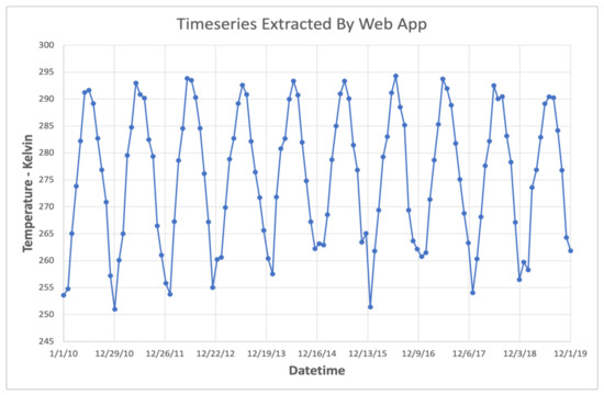 We deployed the GLDAS App on web servers in cloud environments on both Amazon Web Services and Microsoft Azure. On these cloud instances, users were successfully able to query time series of the GLDAS dataset with the available data range going from a few months up to, and including, the entire time range (January 1948 through the present). At the time of the tests, the web server which hosted the app was experiencing near-ideal conditions similar to the local network THREDDS instance described previously. Consequently, the measured speeds were comparable to those presented for an ideal web processing service. Figure 10 shows an example 10-year time series of air temperature extracted using the web interface to the GLDAS App.
