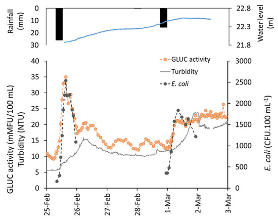 As previously reported by Sylvestre et al. [23], turbidity and flow rate peaks were delayed by 18 and >48 h, respectively, compared to the FIB peak. The turbidity and fecal indicator bacteria can correlate during runoff events in surface waters (e.g., [41]). In other cases, the turbidity is poorly correlated with FIB, suggesting different sources and transport dynamics within a catchment (e.g., [42]). Here, the reactivity of the large watershed to rainfall was lower than that of the local discharges of untreated sewage, which caused a delay in the turbidity peak compared to the sewage-derived FIB peak. Flow rate has been previously used to (automatically) trigger sampling for microbiological analyses [19,20,21]). However, in our settings, the flow rate peak was even more delayed than the turbidity peak (Figure 1). As a consequence, neither the flowrate nor the turbidity would be appropriate triggers to collect samples for microbiological investigations and associated risk assessment. Instead, GLUC activity appears to be a more suitable trigger for this purpose under the present settings.