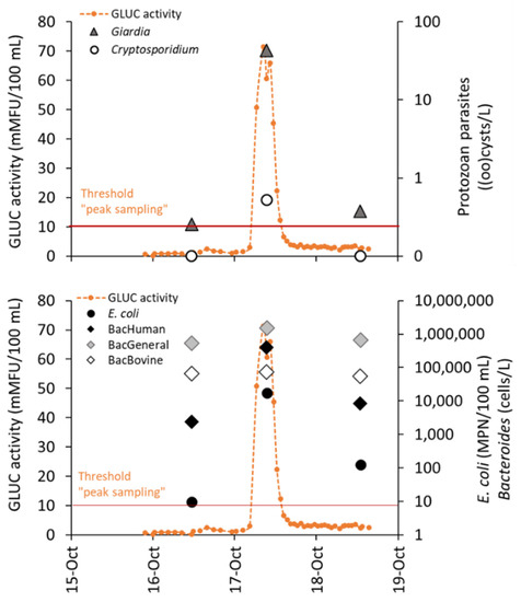 Acquiring meaningful data for microbial risk assessments in water is paramount and requires representative samples [1]. Given the inherent variability in microbiological water quality in groundwater and surface water [2,3,4,5,6]), inadequate sampling strategies can miss intermittent contamination events [7]. Yet, as illustrated by past and recent waterborne outbreaks, such hazardous events can have significant implications for public health if they occur during drinking water treatment failures [8,9]. Rainfall has long been identified as a major trigger of waterborne outbreaks [10], as well as for the incidence of gastrointestinal illness during recreational exposure [11]. During wet weather events, enteric pathogens are released into waterways through agricultural and urban runoff as well as untreated sewage discharges, and they can ultimately reach drinking water intakes or recreational areas. Because the direct measurement of pathogens is cumbersome and expensive, regulatory water quality monitoring mostly relies on fecal indicator bacteria (FIB) such as E. coli or enterococci (ENT), and only in a limited number of countries such as in the USA, regulatory monitoring of the protozoan pathogen Cryptosporidium is performed in source waters of large drinking water supply systems [12]. The monitoring of FIB (or Cryptosporidium in some instances) in drinking water supplies is usually carried out periodically (weekly to monthly), at predefined days [12,13]. At best, the daily monitoring of FIB may be performed locally, but usually during weekdays only. Periodic sampling of FIB is also common rule for the regulatory monitoring of recreational water quality [14,15]. Given that fecal contamination events can appear and disappear within less than 24 h at any time, even daily monitoring can miss such short-term episodes. Appropriate tools and assays are therefore needed to enable the collection of representative data accounting for (short-term) fluctuations in microbial water quality [16], which should ultimately help improve microbial risk assessment within the framework of water safety planning [1,17]. In a recreational context, targeted assessments of the microbial risk associated with intermittent contamination events that may be missed by routine monitoring schemes would help avoid the unintended direct exposure of bathers to potential gastrointestinal-illness-causing agents.