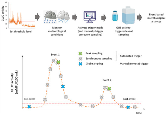 Targeted sampling for the measurement of microbiological water quality is a crucial component of a representative assessment of hazards and risks in a specific area and water usage [1]. It is well acknowledged that the microbiological quality of surface waters significantly deteriorates during rainfall-induced runoff events [4,20,43,44,45], but these events are difficult to capture by fixed time sampling strategies. Automation of the sampling process is therefore a first step towards collection of samples during periods that are usually not covered by routine sampling frameworks. The other key step consists in the selection of a representative surrogate that is continuously measured in real-time and that can trigger sample collection at the right time. Based on a sound knowledge of the temporal dynamics of that surrogate, an appropriate threshold can be set to delimitate the triggering conditions (Figure 3). Weather forecasts are the starting point of the event-based sampling strategy and one or several pre-event samples should be collected prior to the expected fecal pollution peak event. These samples are collected by the autosampler after manual trigger, before activating event sampling modes (peak or synchronous sampling). The actions can be carried out either onsite or remotely using the online interface of the instrument, which further enables users to monitor the GLUC activity measurements and triggering actions remotely and in real-time. In the case of high-volume samples (>10 L) for enteric pathogen analyses, samples can be filtered onsite before laboratory analyses.