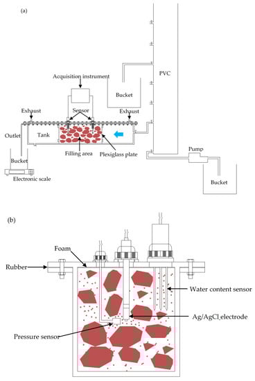 Sketch of the experimental apparatus. (a) The apparatus consists of tank (filling area, plexiglass plate, exhaust, outlet), PVC pipe (pump, bucket), and data acquisition system (sensor and acquisition instrument), the blue arrow represents the direction of the water flow. (b) Cross section through the sensor (water content sensor, Ag/AgCl non-polarizable electrode, pressure sensor, rubber, foam).