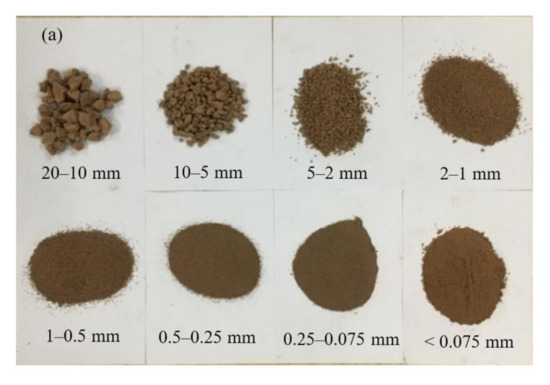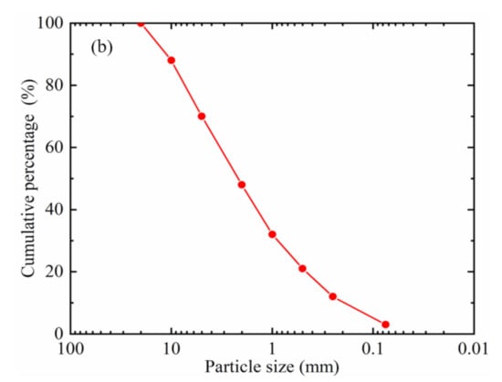 The material of the SRM is weathered broken argillaceous rock with a maximum particle size of 60 mm, natural water content of 2.57%, and specific gravity of 2.72. To prevent the emergence of oversized soil, the maximum particle size should be less than 10 times the width of the water tank [45]; therefore, the maximum particle size of the material is less than 20 mm after sieving (see Figure 2a). In this paper, the threshold value of soil and rock is referred to the 5 mm adopted by Zhou et al. [45], that is, more than 5 mm is rock and less than 5 mm is soil. The gradation curve designed in this experiment is shown in Figure 2b, along with the content of each particle size: 20–10 mm (12%), 10–5 mm (18%), 5–2 mm (22%), 2–1 mm (16%), 1–0.5 mm (11%), 0.5–0.25 mm (9%), 0.25–0.075 mm (9%), and <0.075 (3%). The same grading curve was adopted for SRMs with different compactness. The nonuniform coefficient Cu (a factor reflecting the degree of uniformity of particle gradation in the soil) is obtained from the following equation [46]:
