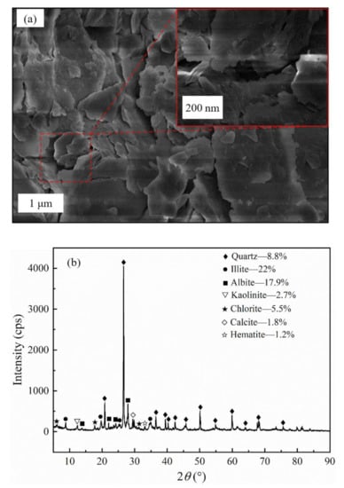 where d30 denotes the particle size of 30% of the total mass on the particle size distribution curve. To avoid piping during the test, we calculated Cu and Cc values to determine the gradation characteristics of the soil. Cu = 16.5 and Cc = 1.23. Cu ≥ 5 and Cc = 1–3 are considered to be well-graded soils [47]. Figure 3a shows the SEM image of argillaceous particles surface. We found that the surface of the particles had an irregular scaly stacking structure, with slight alterations at the edges, and a small number of suspected holes after local amplification. We obtained the mineralogy of the rock using X-ray diffraction (see Figure 3b). The mineral composition of the argillaceous rock was quartz (48.8%), illite (22%), albite (17.9%), kaolinite (2.7%), chlorite (5.5%), calcite (1.8%), and hematite (1.2%).