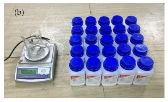 In the experiment of SRM with different solution concentrations, we designed five concentrations (0.0001, 0.001, 0.01, 0.1, and 1 M) of NaCl solution. The mass of NaCl and the volume of deionized water were calculated. A NaCl white crystalline material with 99.5% purity was used in the experiment (as shown in Figure 4b). CJ-CS-K03 automatic ultra-pure water equipment (Dongguan sibaikang Environmental Protection Technology Co., Ltd., Dongguan, China) provided deionized water for this test and monitored its conductivity during the preparation of the solution. After compacting the SRM in the water tank, it was left in the NaCl solution until the upstream and downstream equilibrium were achieved. The pH value of the solution was measured using an AZ-86031 multifunctional water quality detector (AZ Instrument Corp., Taiwan, China) (measurement range: 2–12, accuracy: ± 0.1, resolution: 0.1) at 0.0001 – 0.1 M salinity and the PHS-25 pH meter (Shanghai INESA Scientific Instrument Co., Ltd., Shanghai, China) (measurement range: 0.00–14.00, accuracy: ± 0.05, resolution: 0.01) at 1 M salinity, respectively. In the test where the degree of compaction is 75–95%, we measured the pH values as 7.3 ± 0.2, 7.5 ± 0.1, 7.5 ± 0.3, 7.5 ± 0.2, and 7.6 ± 0.3, respectively. In the test with salinity ranging from 0.0001 to 1 M, we measured the pH values as 7.6 ± 0.2, 7.4 ± 0.3, 7.5 ± 0.3, 7.3 ± 0.3, and 7.2 ± 0.1, respectively.