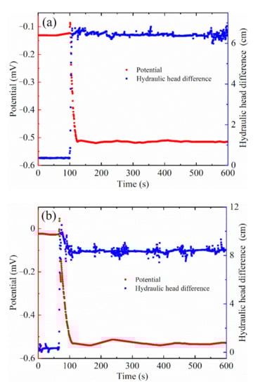We measured the potential of SRM ψ0 (mV) at rest before each test. After the potential was stable, the hydraulic head was suddenly applied to the upstream water tank. The potential ψ1 (mV) and hydraulic head difference H (cm) during flow were measured. The streaming potential ∆U (mV) is obtained using Equation (6) in the steady state as follows: