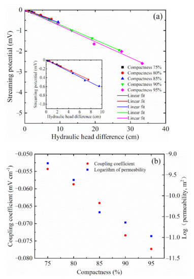 The streaming potential is calculated using Equation (6). Figure 6a shows the linear relationship between the streaming potential and hydraulic head difference. The streaming potential decreases with the decrease in compactness. The rate of decrease rapidly rise, particularly when the compactness decreases by more than 85%. The streaming potential coupling coefficient for different compaction degrees was obtained using the slope of the linear regression (see Figure 6b). The streaming potential coupling coefficient increases gradually with an increase in compactness, but the variable amplitude of the streaming potential coupling coefficient is small. The streaming potential coupling coefficient increases with a decrease in the permeability. The zeta potential is obtained from Equation (2). Table 2 shows that the zeta potential increases with the increase in compactness.