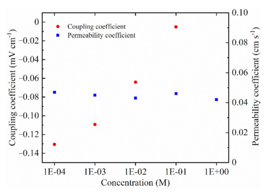 The relationship between the coupling coefficient and permeability coefficient of SRM at different concentration. The streaming potential coupling coefficient is equal to the slope of the linear regression.