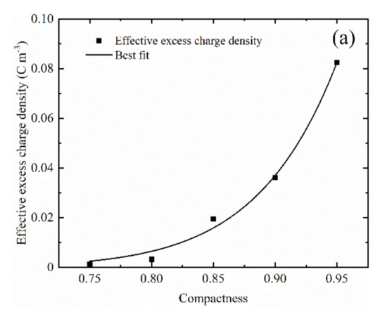 The effective excess charge density is determined by Equation (3). We obtained the relationship between the effective excess charge density and the compaction degree and concentration by power law fitting (see Figure 8). The effective excess charge density increases with the increase in compactness and decreases with the increase in concentration. The feature of these fits can be described by the relationship, respectively: