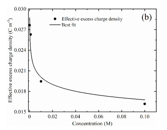 Another option to take into account the effect of surface conductivity on the coupling coefficient is the effective excess charge approach. The basic idea of this approach is to use the effective excess charge in the diffusion layer to be dragged by the water flow to explain the generation of streaming potential, and the quantitative relationship between the coupling coefficient and the effective excess charge density is established [29,30]:
