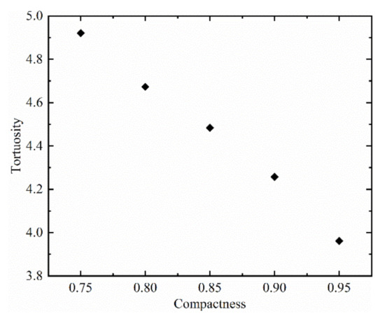 where the τ is the tortuosity, the ϕ is the porosity. Figure 9 shows that the tortuosity decreases with the increase in compactness. The difference of particle size is large and the spatial distribution is uneven, so the tortuosity of SRM is large. According to Equation (12), there is little difference between the formation factors, the magnitude of the tortuosity is determined by porosity and, hence, the tortuosity is larger when the compactness is low.