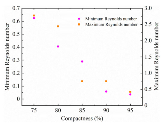 Several reports have shown that streaming potential coupling coefficient is affected by the flow state. In the viscous laminar flow regime, the streaming potential coupling coefficient is obtained by Equation (1). We calculate the minimum and maximum Reynolds number of the seepage process of SRM with different compactness. The Reynolds number is given by [46]: