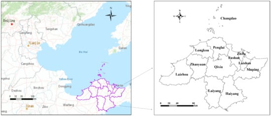 Yantai is located in the eastern part of the Shandong Peninsula, China, and is an important port city in the Bohai Rim. The city governs 12 county-level administrative regions, with complex terrain conditions, as shown in Figure 1. The elevation is high in the middle of the territory, and low in the south and north, with the range of 0~922.8 m. The climate belongs to the warm temperate continental monsoon climate. It has an annual average temperature of 13.0 °C, a sunshine hour of 2611.6 h and an average annual precipitation of 680 mm. The precipitation is concentrated in summer (from June to September), accounting for more than 70% of the annual total precipitation. However, the spatial distribution of rainfall is uneven, which is significantly more in the central and southern hilly than the northern coastal areas. The water volume of rivers is greatly affected by rainfall, and drying-out of rivers are common to see during non-flood season. Water resources are extremely scarce in the city, with an average total water resources of only about 3.2 billion m3 over the years. Additionally, per-capita water resource is less than 500 m3, which is only one-fifth of the national average level. The lack of water resources has become an important limiting factor for future development. As the acceleration of urbanization, there are a large number of industrial zones, ports and docks under construction. Compared with other coastal cities, the proportion of industrial land in Yantai is relatively large, which has a greater negative impact on the environment. The urban ecological space has been drastically reduced, and environmental pollution has become more and more serious.