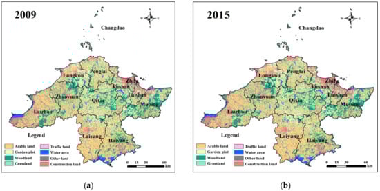 (a) Distribution of land use types in Yantai in 2009; (b) distribution of land use types in Yantai in 2015.