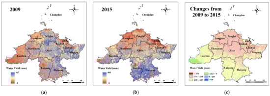 (a) Spatial distribution of water yield in Yantai in 2009; (b) spatial distribution of water yield in Yantai in 2015; (c) changes of water yield in Yantai from 2009 to 2015.