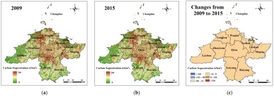 (a) Spatial distribution of carbon sequestration in Yantai in 2009; (b) spatial distribution of carbon sequestration in Yantai in 2015; (c) changes of carbon sequestration in Yantai from 2009 to 2015.