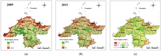 (a) Spatial distribution of food supply in Yantai in 2009; (b) spatial distribution of food supply in Yantai in 2015; (c) changes of food supply in Yantai from 2009 to 2015.
