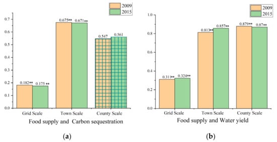 (a) Spatial synergies between food supply and carbon sequestration services in 2009; (b) spatial synergies between food supply and carbon sequestration services in 2015.