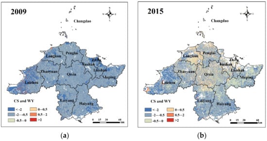 The high-value areas of CS in 2009 were mainly concentrated in the inner area of the city. These areas were mostly hilly and had a dense distribution of woodland and garden plot, which can store more carbon compared to other land-use types. There was low CS value in coastal areas and the urban core (Zhifu, Fushan and Laishan). This was mainly due to the fact that these areas were mostly plain, with high population density, developed economy, less ecological land and weak CS capacity. Compared with 2009, CS in 2015 changed little, and most of them changed in the range of [−11 t/hm2, 0 t/hm2], as shown in Figure 4. The CS capacity has a slight decrease in most areas of Yantai. Due to the decrease of ecological land, the CS capacity of the region reduced [79,80,81].