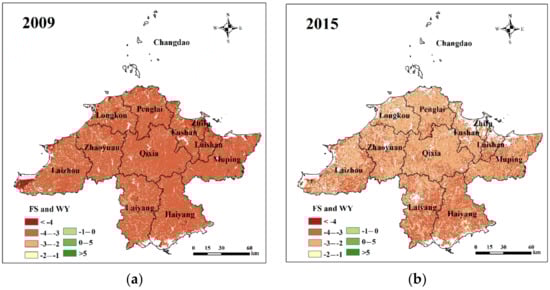 In 2009, the synergy between FS and WY was highly dominated by WY, with the synergy index in the range of [−4, −3] in most regions. In 2015, the synergy between FS and WY increased but the leading role of WY was weakened, as shown in Figure 8. The synergy index of Penglai, Longkou, Qixia and Zhaoyuan changed from [−4, −3] to [−3, −2], and there were few areas with a synergy index less than −4.