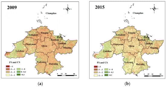 The synergy between FS and CS was likely to the previous two. The three pairs of ecosystem services were all dominated by one of the ecosystem services. In 2009, the synergy was dominated by CS. The areas with the strongest leading role of CS were mostly concentrated in Laizhou, Penglai and Haiyang, with a synergy index less than −5. In the vast inland areas of Yantai, including Qixia and Mouping, CS dominated as well. In 2015, the dominant ecosystem service was still CS, but the intensity decreased, as shown in Figure 9. The area where the synergy index was between [−3, −2] was reduced, while [−2, −1] increased significantly.