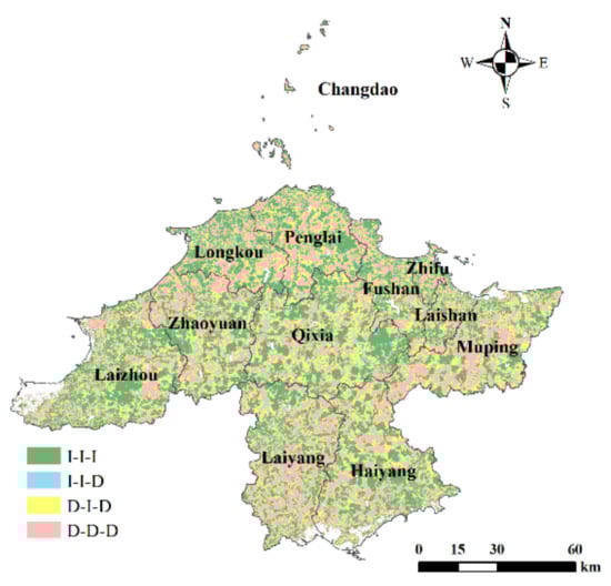 As shown in Figure 11, the city was divided into four demands changing areas: I-I-I, I-I-D, D-I-D and D-D-D, according to the classification rule in Table 3. I-I-I, which represents the increase of three ecosystem services demands, accounts for the largest proportion of 35.99% in the whole city. I-I-D means increase in WD and CD but decrease in FD, was least in the four. There only was an increase in CD in D-I-D. Additionally, in D-D-D, all the three demands decreased.