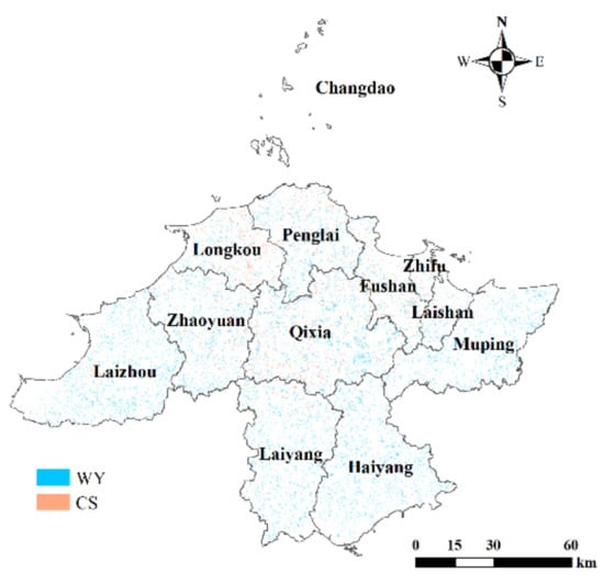 From the spatial distribution, the pattern of WY in 2009 and 2015 was quite different, as shown in Figure 3. In 2009, the areas with high WY were mainly concentrated in the central-eastern part of Yantai. This was mainly related to the high rainfall and elevation in this hilly area. Additionally, there was a weaker land surface evapotranspiration in here than in urban core and developed coastal areas. WY was significantly weaker in the urban core (Zhifu, Fushan, Laishan), western Laizhou and northern Longkou. In 2015, Haiyang and Muping were the areas with the strongest WY in the city. This had a strong correlation with the distribution of precipitation in 2015, which was obviously high in the south and low in the north. WY capacity in the urban core and coastal areas of Yantai was still weak while it in Laizhou was significantly enhanced in 2015. Even though the precipitation of Qixia was low, its WY capacity was still at a medium level in the city with its hilly terrain. The analysis indicated that precipitation and topography were the key factors affecting WY. From 2009 to 2015, the WY was in a state of loss in most areas of Yantai, especially in the north and central part. Compared to 2009, the value of WY loss on each grid in 2015 was in the range of [−374 mm, −238 mm]. WY decreased relatively smaller in western Laizhou, Laiyang and Haiyang, but it was also in the range of [−238 mm, −127 mm]. The western part of Laizhou was the area with the lowest loss of WY. There were few areas of increasing WY, most of which were distributed in coastal areas of Laizhou and Haiyang. The increase was most likely related to the monsoon climate in the region.