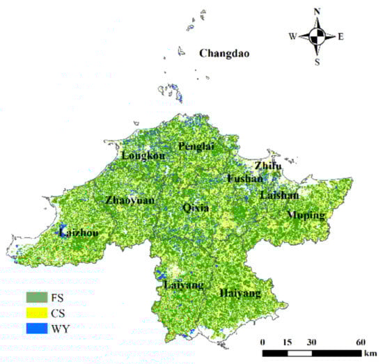 Bohai Rim is the gold coast of the northern coast of China, including three urban agglomerations (Beijing-Tianjin-Hebei, Central South Liaoning and Shandong Peninsula). Additionally, it is one of the three major economic growth poles in China. Since the implementation of China’s reform and opening-up policy and gathering of labor, capital, technology and other production factors, there has been a continuous improve of economic level and development of infrastructure construction in coastal areas. The Bohai Rim region has developed into the center of the North-East Asia Economic Circle. However, the Bohai Rim was faced with enormous environmental pressure, due to the irrational industrial structure and the extensive mode of economic development [58]. Currently, the amount of land-sourced pollutants entering the sea in the Bohai Rim has increased dramatically [59]. Marine and air pollution has worsened, and the natural coastline has shrunk sharply. The resources and environmental carrying capacity have been overloaded [60,61]. The contradiction between socio-economic development and ecological protection in the Bohai Rim area is becoming increasingly acute [60]. Urgent action is needed to achieve regional sustainable development. In recent years, many scholars have studied the ecosystem services and their changes [62], ecological risks [63] and ecological efficiency in Bohai Rim [64]. While using authoritative land-change survey data to analyze the spatiotemporal characteristics of trade-offs/synergies, scale effects, driving mechanisms and improvement of ecosystem services is lacked. Therefore, it is necessary to explore the spatial patterns of ecosystem services trade-offs and synergies, and propose some improvement suggestions in the context of rapid socio-economic development in Bohai Rim. Yantai City, a typical city in the Bohai Rim, was selected as the study area. Even though as a bay city, water shortage is always a big problem for it. Per capita water resource is lower than 500 m3 in over a half of the city. Meanwhile, carbon emission is large in the city because of large proportion of industrial production and mining. However, the city has relatively developed agricultural production, especially in fruits planting [65]. Thus, food supply, carbon sequestration and water yield were chosen as the representative ecosystem services in this study. Based on the land-change survey data, the spatiotemporal distribution characteristics of the three types of ecosystem services were analyzed. Through correlation analysis and the introduction of an ecosystem service trade-offs/synergies index, the spatiotemporal characteristics, scale effects and driving mechanisms of the trade-offs/synergies among the three types of ecosystem services were investigated. Meanwhile, on the basis of trade-offs/synergies and changes in ecosystem services demand, improvement suggestions of ecosystem services were proposed to provide decision support for ecosystem conservation and optimal management in Yantai and other bay city.