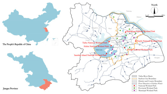 Suzhou (30°45′–32°2′ N, 119°55′–121°22′ E) is located in the southeast region of Jiangsu Province (30°45′−35°7′ N, 116°21′−121°56′), Eastern China. The region has a subtropical monsoon climate with an average annual temperature of 15.7 °C and average annual precipitation of 1100 mm yr−1. Taihu Lake is the third-largest freshwater lake in China and an important water source for the Suzhou National Wetland Park. Suzhou now has 21 national, provincial, and municipal wetland parks, and 102 municipal-level important wetlands (Figure 1). Suzhou National Wetland Park can be divided into four types of landscape structures: block-like uniform, multi-layer cofferdam, multi-pond structure, and block-shaped agglomeration (Table 1). Each year can be divided into four periods, consisting of a dry season (December–February), two normal seasons (March–May, September–November), and a rainy season (June–August).