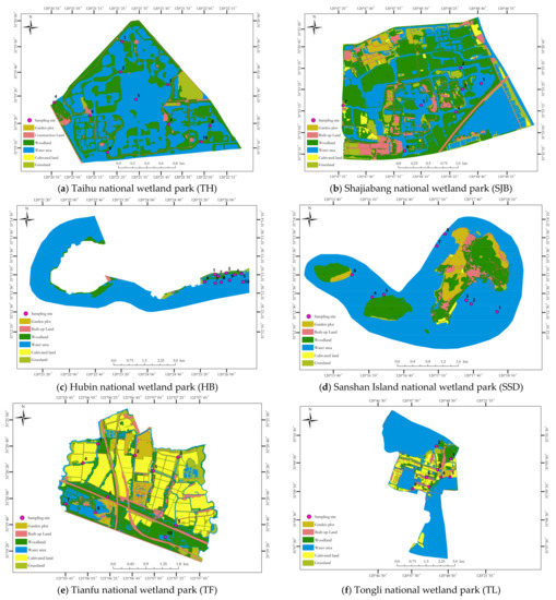 Landscape types and distribution of sampling points in the Suzhou National Wetland Parks: (a) Taihu national wetland park (TH), (b) Shajiabang national wetland park (SJB), (c) Hubin national wetland park (HB), (d) Sanshan Island national wetland park (SSD), (e) Tianfu national wetland park (TF), (f) Tongli national wetland park (TL).