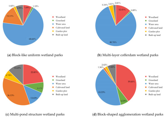 The proportion of land cover classes of: (a) block-like uniform wetland parks, (b) multi-layer cofferdam wetland parks, (c) multi-pond structure wetland parks, (d) block-shaped agglomeration wetland parks.