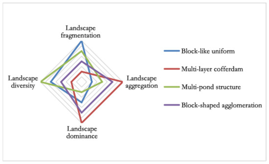 The difference in landscape pattern index between block-like uniform and multi-layer cofferdam wetlands was the largest. The difference in landscape pattern index between block-like uniform and multi-pond structure wetlands was the smallest. The indices for block-shaped agglomeration wetlands were more balanced (Figure 4).