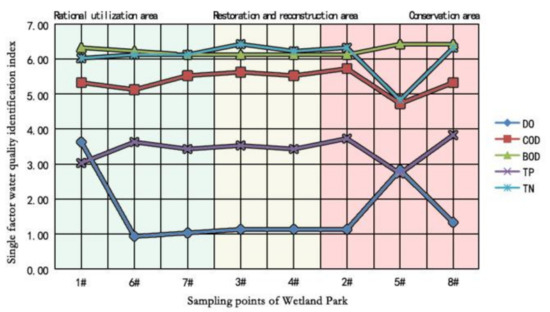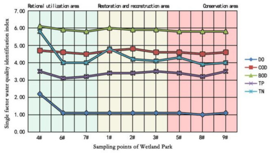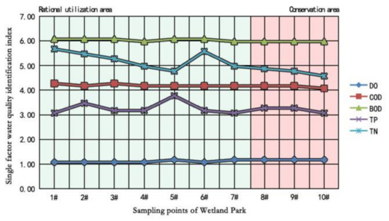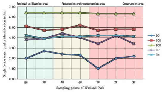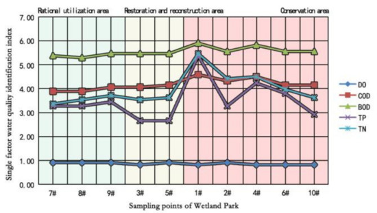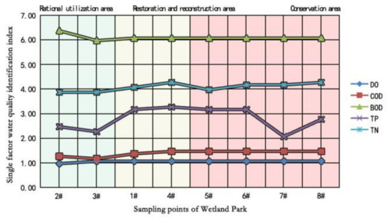 The single factor identification index method was used to arrange the pollution degree of TH water quality parameters from highest to lowest and revealed that BOD > COD > TN > TP > DO. Sampling sites number 1, 2, and 4, located in the north of the wetland park, upstream of the water system, and close to the urban residential area, had the highest parameter values under the influence of human factors. Sampling sites 8 and 10 were located downstream of the river system and had the lowest parameter values. The ranking of SJB water quality parameter values from highest to lowest was BOD > COD > TN > TP > DO. Sampling site number 6, nearest to the entrance, and number 5, in the central tourist area, were most affected by human interference. Sampling site number 4 was originally a mulberry fishpond, and although it has been abandoned for many years, the TP was still high. The ranking of HB water quality parameter values from highest to lowest was BOD > TN > COD > TP > DO. Sites 7, 8, 9, and 10, which were farthest from the shore, had the best water quality parameter values. Sites 1, 3, and 5, which were closest to the shore, had the worst water quality parameter values due to the human disturbances that occur urban residential areas.