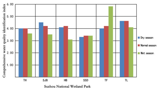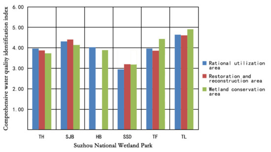 The water quality of wetland parks ranked from good to bad was SSD > TH, SJB, HB > TL, TF. The results show that SSD water quality was class III for the whole year, while TH, SJB, and HB water quality was class IV in the dry and normal seasons and improved to class III in the rainy season. The water quality at TL also improved during the rainy season but remained in class IV throughout the year. TF water quality was class IV in the dry season and normal season, but it decreased to class V during the rainy season (Figure 11). Comparative analysis of water quality in different functional zones revealed that the pollution at TH, SJB, HB, and TL was greatest in the rational utilization area, followed by the restoration and reconstruction area, and lowest in the conservation area. Changes in the comprehensive identification index ranged from class III to class IV. The pollution at SSD was greatest at the restoration and reconstruction area, then at the conservation area, and at the rational utilization area. The rational utilization area was class II, which was the best among all wetland parks. The worst water quality in TF wetland conservation area was class IV, and water quality in rational utilization area was better than in the restoration and reconstruction areas, both of which were class III (Figure 12).