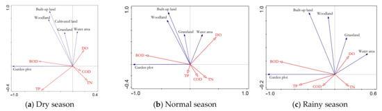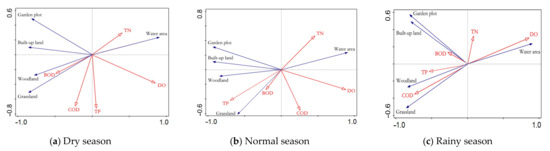 The TP in all seasons and the BOD in the normal and rainy seasons were greatly affected by AI (adjusted R2 > 0.5). The water area had highly significant negative and positive correlations with TP and DO, respectively. Water area also had a negative significant correlation with COD and BOD. Woodland had a negative significant correlation with TN and TP. Garden plot had positive and negative significant correlations with TP and DO, respectively, as well as a highly significant negative correlation with BOD. Grassland had significant and highly significant negative correlations with TN and TP, respectively. Built-up land had a positive significant correlation with DO and was weakly correlated with the other water quality indices.