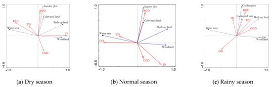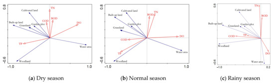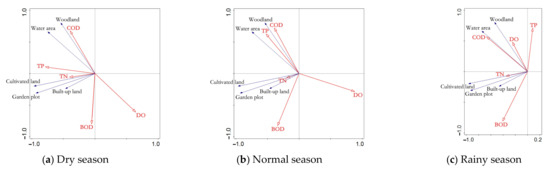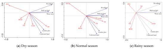 Redundancy analysis ranking diagram of landscape area percentage and water quality index in (a) dry season, (b) normal season, (c) rainy season.