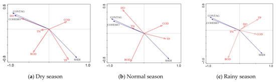 Redundancy analysis ranking diagram of landscape pattern index and water quality index at the landscape level in (a) dry season, (b) normal season, (c) rainy season.