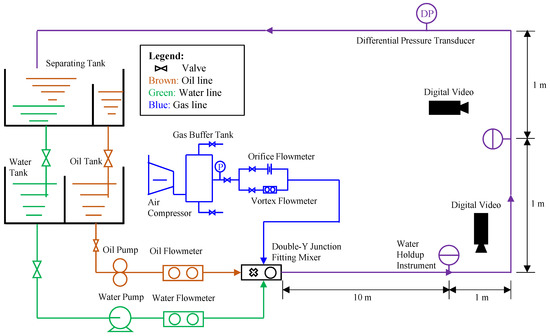 Schematic drawing of the flow loop for the oil–water–gas three-phase flow used in this study.