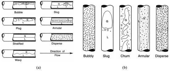 Schematic representation of the (a) horizontal and (b) vertical gas–liquid flow patterns defined by Weisman [28].
