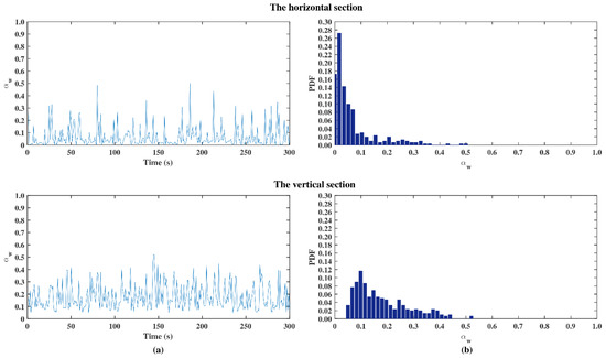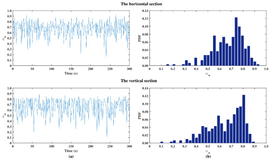Figure 6 and Figure 7 show the typical time-series data of the cross-sectional average water holdup αw and the corresponding PDF as a function of the water holdup for different superficial velocities in both the horizontal and vertical sections [4]. Figure 6 shows the data for Frm = 0.368, usg/usm = 0.50, and . In the horizontal section, plug flow was observed. With the increase in the gas flow rate, small bubbles coalesced in the upper part of the pipe to form large bubbles. Few small bubbles existed between the large bubbles. The plug flows were characterized by two peaks in the PDF at αw = 0.55 and 0.75 in this case. The two peaks corresponded to the bubble region and the plug region, respectively. In the vertical section, slug flow was observed under the same experimental conditions. Taylor bubbles and liquid slugs between two adjacent Taylor bubbles formed slug flows. Many small bubbles were distributed between the Taylor bubbles, which is referred to as the wake region [29]. In this study, slug flows were characterized by three peaks in the PDF at αw = 0.45, 0.60, and 0.80. The regions at αw = 0.45, 0.60, and 0.80 corresponded to the Taylor bubble, wake, and liquid slug regions, respectively.