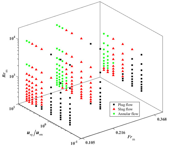 Flow pattern maps were developed for the oil–water–gas pipe flow in the horizontal and vertical sections, which are shown in Figure 8 and Figure 9. In these figures, the x-, y-, and z-axes corresponded to the dimensionless numbers Frm, usg/usm, and Rem, respectively. Frm values of 0.105, 0.216, and 0.368 were investigated, and Rem and usg/usm were in the ranges of 298–21,193 and 0.25–6, respectively. The flow pattern maps depended on the pipe size and the size of the gas inclusions. The flow pattern maps in this study were constructed for D = 50 mm.