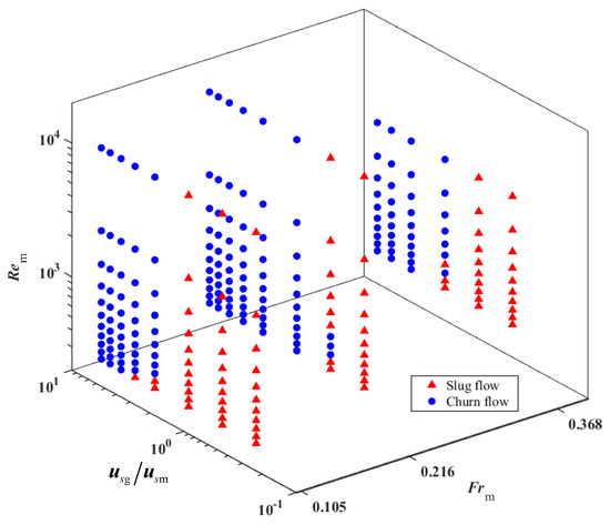 Flow pattern maps in the vertical section, in which the dimensionless number Rem ranged from 298 to 21,193, the dimensionless number usg/usm ranged from 0.25 to 6, and the dimensionless number Frm was fixed at 0.105, 0.216, and 0.368.