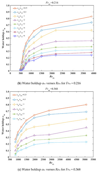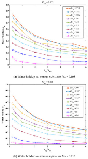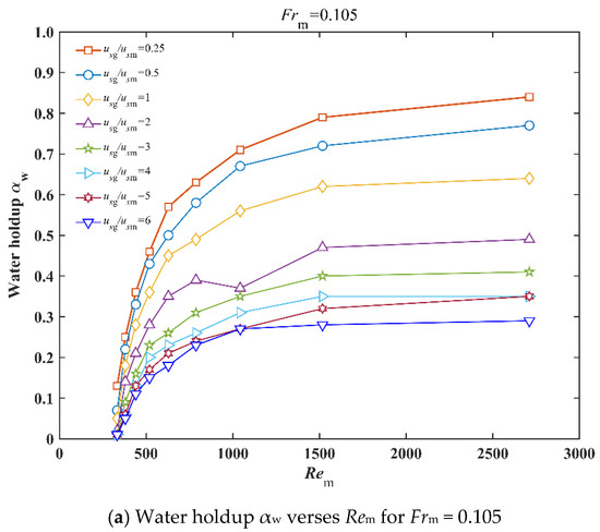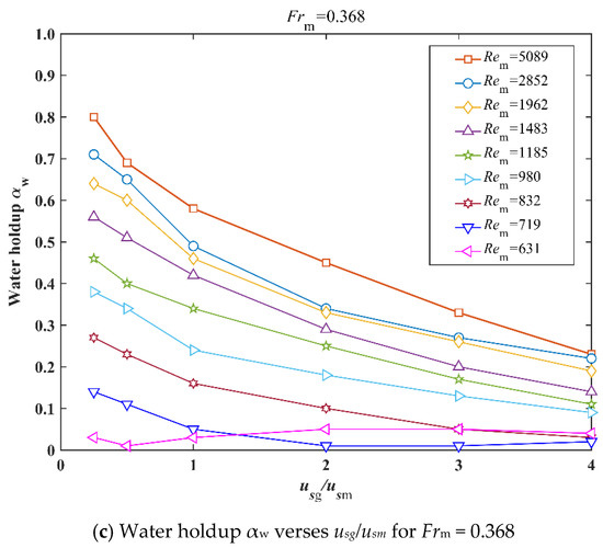 Figure 10 illustrates the relationship between the measured water holdup αw and usg/usm for different Rem values. Frm values of 0.105, 0.216, and 0.368 were investigated. The increase in usg/usm led to a decrease in the water holdup. For a given usg/usm, the water holdup decreased with the decrease in Rem. Moreover, for large usg/usm, the amount of decrease of the water holdup became smaller and smaller until it remained unchanged. For low Rem (corresponding to input water cuts of 0.1 and 0.2), the error of the measured water holdup was large, causing the water holdup to show different trends. According to Figure 10a–c, it is noted that the trend between αw and usg/usm remained essentially the same, regardless of the value of Frm. The value of usg/usm had an important influence on the water holdup αw.