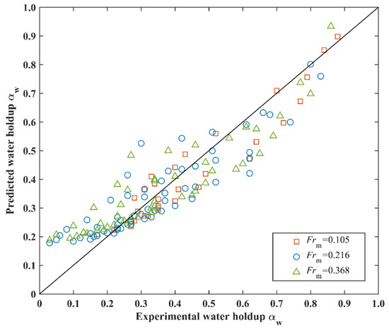 Figure 12 depicts a comparison of the predicted water holdup and the experimental data. The square, circular, and triangle symbols represent the data for Frm = 0.105, 0.216, and 0.368, respectively. The developed correlation (Equation (19)) demonstrates a good agreement with the experimental data. It is noted that the result measured by the water holdup instrument was smaller than the real water holdup αw in the pipe when the input water cut εw was less than 0.3. This was the reason for the predicted water holdup being away from the correlation reference line in the bottom-left part of the diagram. This discrepancy can be solved by improving the accuracy of the water holdup instrument in future research. Moreover, there was no evident structure to the degree of correlation with respect to the values of the Froude number Frm of the oil–water mixture. This proved the applicability of Equation (19) for different Froude numbers. The power-law water holdup correlation is dimensionless, and it can be extended to other conditions. As can be seen in Figure 13, the classical Beggs-Brill empirical model [31] and the developed correlation (Equation (19)) in this study are used to predict the experimental water holdup data. The performance of Equation (19) is better than that of the Beggs-Brill model.