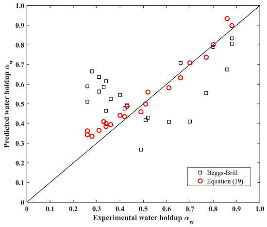 Comparison of different models predicting water holdup with the experimental data for the gas–water two-phase flow. The input water cut εw is equal to 100%. The red circles corresponded to Equation (19), the black squares corresponded to the Beggs-Brill empirical model [31].
