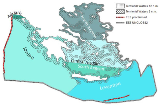 The Mediterranean subregions, as in 2008/56/EC, in which Greece has territorial waters include: (i) the Aegean–Levantine Sea (≤6 nautical miles), (ii) the Ionian Sea and the Central Mediterranean Sea (≤12 nautical miles), and (iii) the Adriatic Sea (≤6 nautical miles).