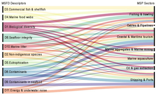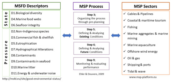 MSPD and MSFD represent different perspectives on the marine environment. Jones et al. [9] compared the ‘soft sustainability’ of the MSPD, in which the needs of different maritime sectors are balanced, with the ‘hard’ sustainability of the MSFD, in which ecosystem conservation is the core of the ecosystem-based approach. Although both directives have specific objectives, Boyes and Elliott (2014) [10] have highlighted the importance of linking their efforts. In addition, Maza et al. (2020) [11] stressed the need to streamline the widely scattered marine policy landscape and consider all relevant European policies while implementing their obligations. At the end of the day, by resolving conflicts and regulating maritime activities that are drivers of state changes, MSP can make a significant contribution to achieving GES [12].
