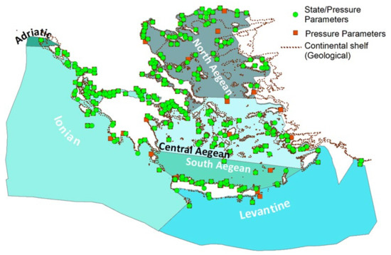 Coastal and marine environments are usually influenced by human-induced and natural pressures which may alter their functioning and contribute to ecosystem degradation and pollution problems [85]. The marine environment of Greece is impacted by the introduction of nutrients, organic matter, synthetic and non-synthetic substances, and radionuclides from point and/or diffuse sources, atmospheric deposition, or acute events. In addition, litter (macro and micro-sized) and anthropogenic sound affect the Greek marine environment.