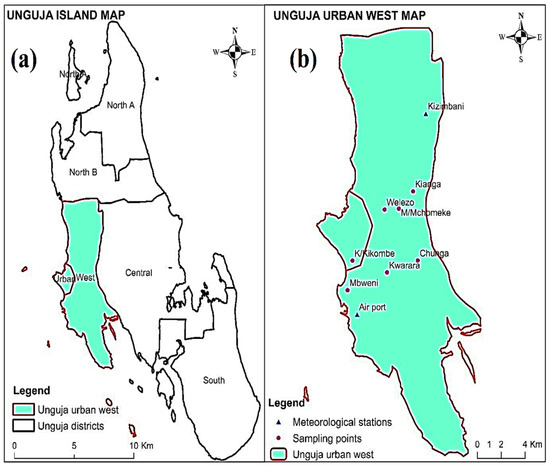 A map of the island of Zanzibar (Unguja) indicating different regions (a) and wards of the Urban West region (b) where the original sampling took place. Used with permission from Ali and Rwiza [31].