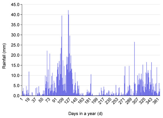 In the current study, all 365 days of the year were considered, and a runoff coefficient of 80% for the metal roofs and daily rainfall data were used in the analysis (Figure 2). Fixed demand conditions were considered, keeping in mind the fact that the minimal recommended daily water consumption per person is 20 liters [19] and that the average household size is 5.6 members. Two case studies were considered for illustration purposes: (1) individual households and (2) a hotel business as a representative enterprise in the tourism industry.